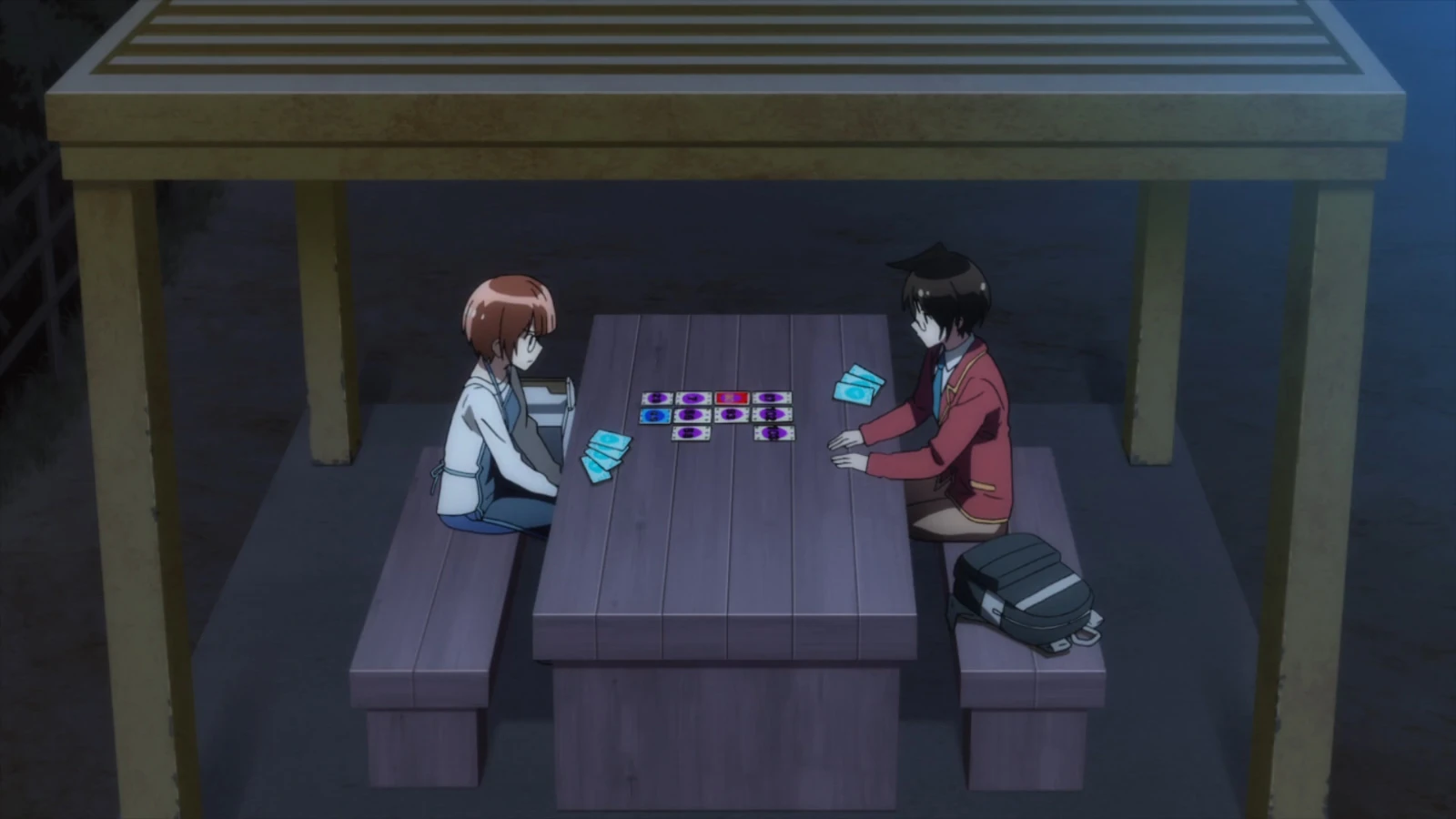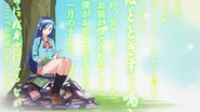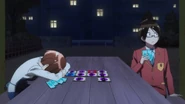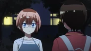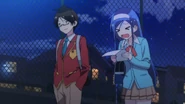 Nariyuki genuinely wishes her luck, but Fumino becomes a little self-conscious about it and notes how childish she sounds from it. Nariyuki believes otherwise and tells her that he is the same and thus wants to continue helping her progress in science which Fumino happily takes as a promise from him. Sometime later, Nariyuki notes to himself how he never knew Fumino could be so clear with her goal and wonders if Rizu is the same and coincidentally spots Rizu by herself at Kusumoto Park. Rizu sees Nariyuki and the latter asks what she is doing in the park, alone. She answers that she is taking a break after finishing a delivery run and Nariyuki asks what she is doing. Rizu answers that she is playing a card game meant for two to ten people by herself as she does not know anybody who is interested in games that she likes. Nariyuki offers to play it with her, but ends up beating Rizu twenty-times in a row, to his own astonishment. Nariyuki then asks her if she is actually bad at the game which Rizu reluctantly answers affirmatively. She goes on to say that she isn't good with competitive games and anything else that involves other people's emotions, but still wishes to understand them, stating that she wishes to study psychology. Amazed, Nariyuki advises that Rizu stop going to the park all by herself at night and instead to ask him if she wishes to hang out anytime she wants, which Rizu greatly appreciates and says that she sincerely looks forward to it. Arriving at his house, Nariyuki is greeted by his two youngest siblings, Kazuki and Hazuki. Stepping inside, he is also greeted by his younger sister, Mizuki, and his mother, Hanae. Mizuki walks to her brother and tells him that dinner is ready, but notices the smell left behind by both Fumino and Rizu when they got close to him, visibly upsetting her to her older brother's confusion.