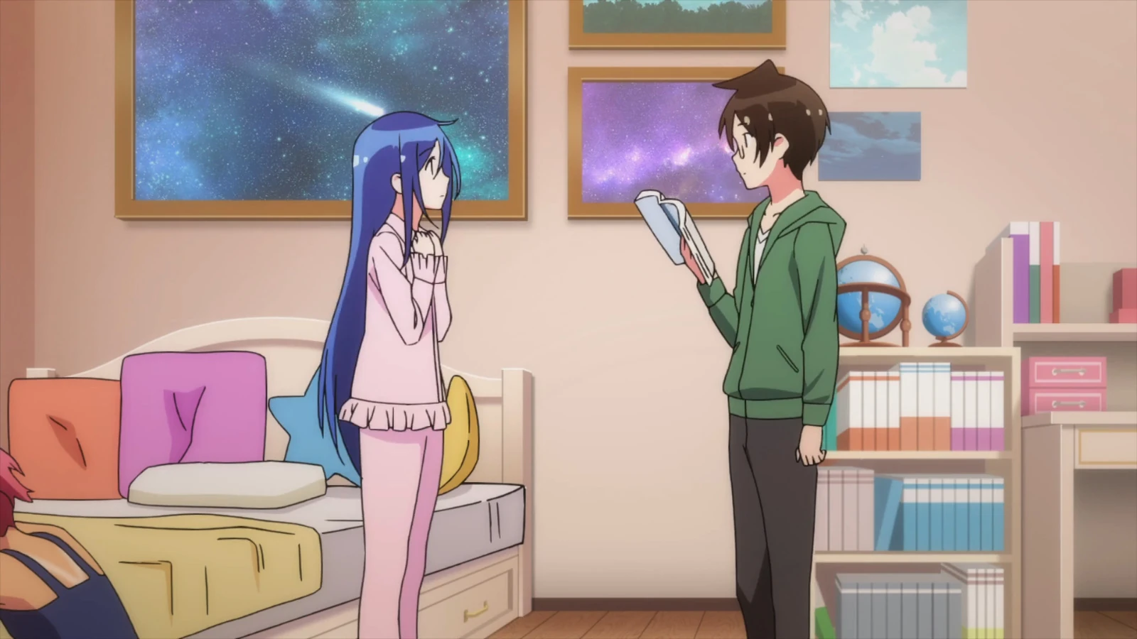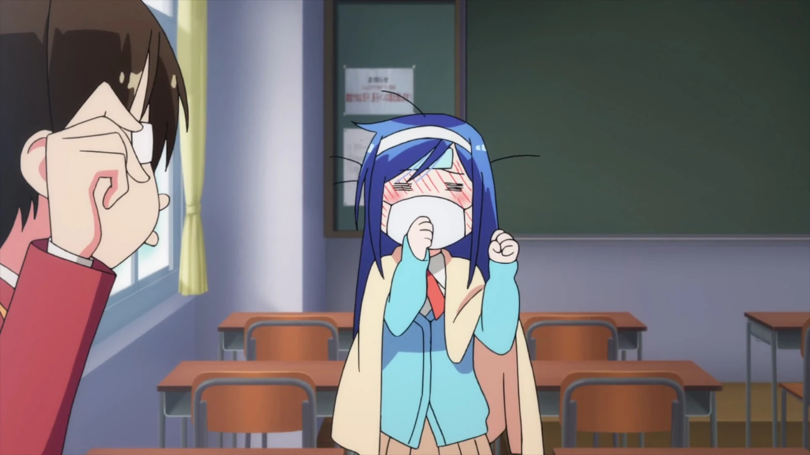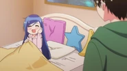 Regaining his composure, Nariyuki notes that they only need Fumino to pass her math test tomorrow, only to find her suffering through a fever. In the school infirmary, Nariyuki checks Fumino's temperature and, unfortunately, confirms that she does indeed have a fever. Nariyuki says that he can talk to their teacher to allow her to take a makeup test the day after, but Fumino refuses, mentioning that a makeup test deducts 20% off the finale score, making getting an average score on Math almost impossible for her. Uruka voices out that all she needs is to get better before tomorrow, electing herself and Nariyuki to look after her until she recovers. Sometime later, Nariyuki is on his way to Fumino's home. Following the address she gave to him. Arriving at her house, Nariyuki is amazed at how nice it looks before entering and making his way to her room. After knocking on the door, he enters immediately and sees Uruka helping Fumino change clothes. Fumino is embarrassed while Uruka scolds Nariyuki and demands that he get out. Outside Fumino's bedroom, Nariyuki is ashamed for his dumb mistake just as Uruka tells him that he can come inside now. Nariyuki asks how Fumino is feeling, but then asks why she is hiding beneath her blanket, with her replying that she is wearing only her pajamas, embarrassing Nariyuki over the thought. Downstairs in the kitchen, Uruka goes to prepare a meal for Fumino.