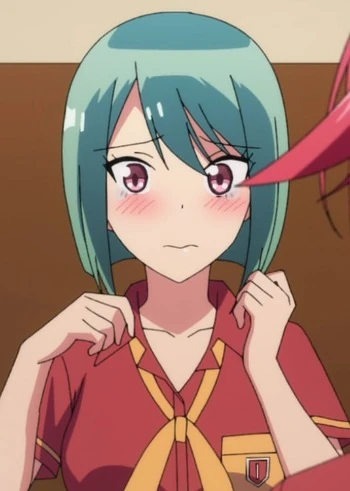 Ikeda has turquoise colored hair in a bob cut and fushia colored eyes.